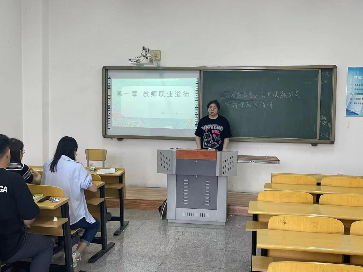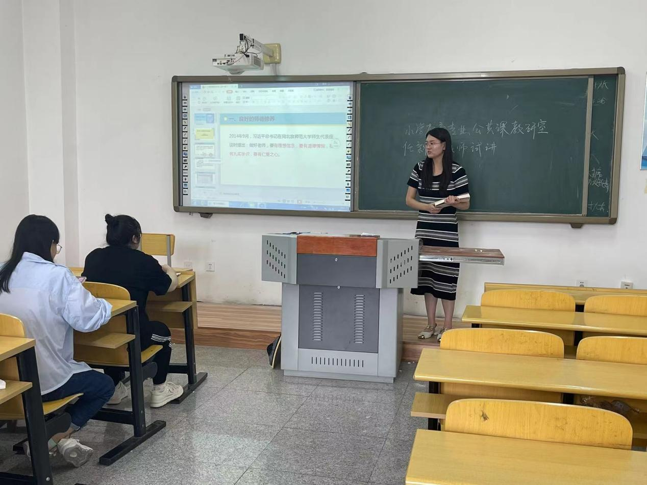 试讲教师分别就《教师职业道德与教育政策法规》、《小学数学课程与教学》等课程的有关内容进行试讲,参加试讲的四位教师准备充分,精神饱满,对教学内容把握准确,教学安排合理,教学方法多样,展示了扎实的教学基本功、精心的教学设计和良好的组织能力。试讲结束后,其他教师对任新课教师的试讲表现作了全面、客观的评价,从授课仪态、课件制作、教学方法、课程思政、板书设计等方面进行逐一点评,对存在的问题和不足之处提出意见和建议。
