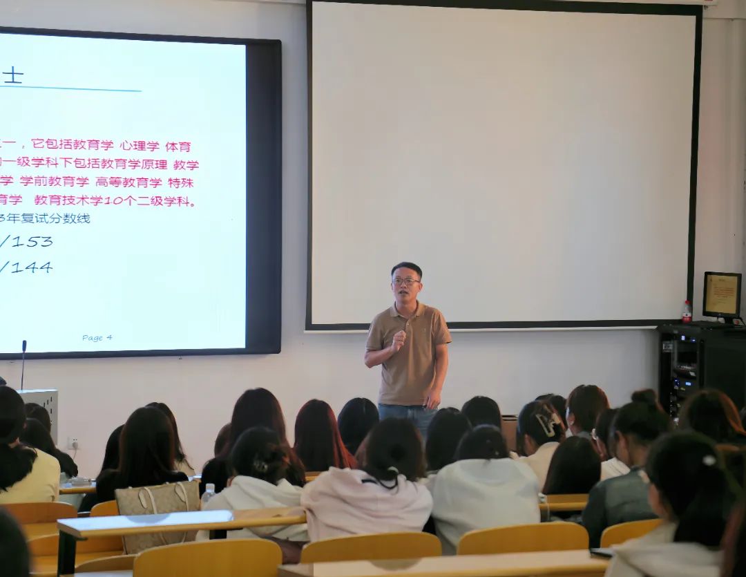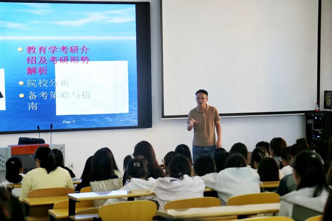 活动伊始,张伟首先强调了考研院校选择的重要性,并从多年的考研指导经验出发,结合历年数据及具体实例,分析了近年来教育学考研形势。他指出:“理想中的公司并不一定是最优选择,还需要综合考虑院校的实际招生情况、团队力量及费用,地域,就业导向等因素,以便做出全面的决策。”其次,张伟还对考研的流程进行详细的讲解,嘱咐同学们要对考研做出具体规划,强调一些考研重要的时间节点,勉励公司学子在攀“研”的道路上珍惜时间,坚持不懈,实现自己的梦想。同时,张伟指出心态的重要性,鼓励同学们要以更加积极乐观的心态科学备考、沉着应考,以最佳的状态迎接研究生考试。讲座过程中同学们认真倾听,反应热烈,同学们纷纷表示,通过此次考研讲座,他们对考研相关知识和要求有了更清晰的认识,并获得实用的备考建议,坚定了考研信心。