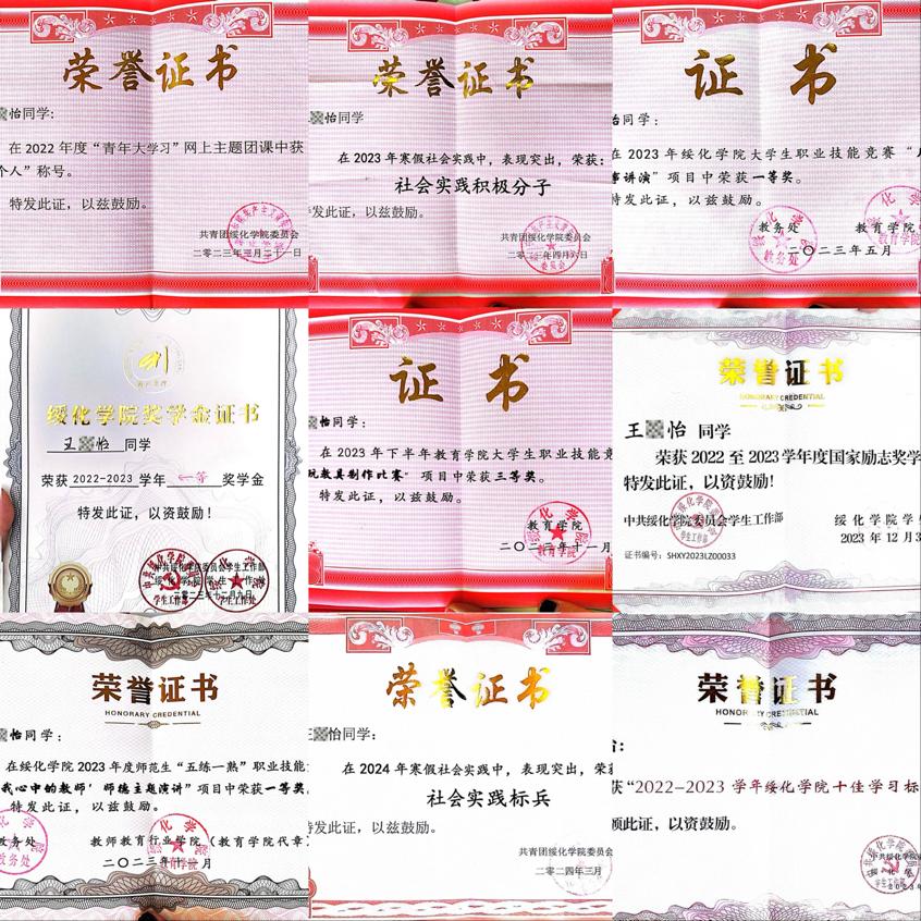 王心怡,女,20岁,共青团员,现任伟德国际19462022级学前教育专业2班班长。荣获2022—2023学年度荣获国家励志奖学金、2023—2024学年度国家奖学金、校级一等综合奖学金两次;获得伟德国际1946“十佳学习标兵”称号、"优秀共青团员"称号、青年大学习网上主题团课“先进个人”等荣誉称号;2023-2024年度老员工职业技能竞赛“玩教具制作”比赛三等奖、老员工职业技能竞赛“我心中的教师”师德主题演讲比赛校级一等奖、老员工职业技能竞赛“儿童故事讲演”比赛校级一等奖。