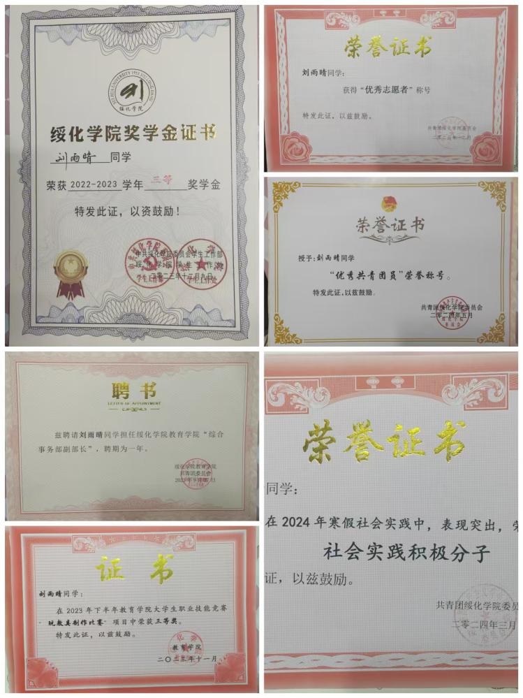 面对学习上的挑战,她从不退缩,始终保持严谨求实的态度,认真对待每一门课程和每一次考试。 通过系统的专业学习,她不仅掌握了扎实的专业知识,还学会了如何运用所学知识解决实际问题。此外,刘雨晴还注重培养自己的学习能力和学习方法,通过制定合理的学习计划和时间管理策略,有效提高自己的学习效率和学习成绩。