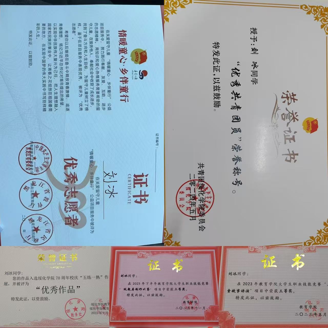 常怀热忱奉献之心,做力所能及之事。在社会实践中,刘冰同学极投身于公益事业,参与特殊儿童影子教师公益活动,为特殊儿童在学习和生活中保驾护航,成为他们成长路上的温暖陪伴。同时,也在关爱留守儿童项目中付出诸多努力,给这些缺少父母陪伴的孩子送去爱与希望