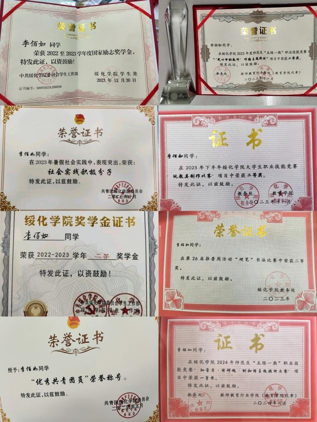 李佰如,女,共青团员,2022级学前教育专业员工,2022级学前教育专业二班学习委员。2022-2023学年度荣获国家励志奖学金、校级二等综合奖学金、2023年暑假社会实践“社会实践积极分子”、“外教社·词达人杯”全国老员工英语词汇能力大赛校级奖、老员工职业技能竞赛“儿童故事讲演”院级一等奖、“军训标兵”称号。2023-2024学年度荣获国家励志奖学金、校级二等综合奖学金、“优秀共青团员”荣誉称号、老员工职业技能大赛“玩教具制作”校级二等奖、老员工职业技能竞赛“我心中的教师”师德主题演讲校级二等奖、第26届推普周活动“硬笔”书法比赛二等奖、2024年师范生“五练一熟”职业技能竞赛"知荣辱·铸师魂·创和谐主题演讲大赛"校级一等奖。