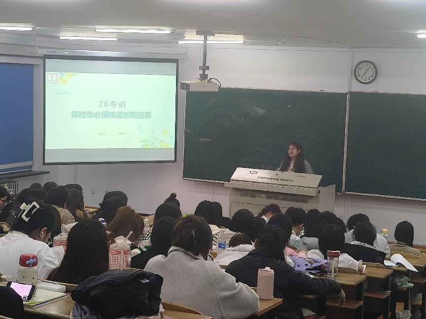 讲座伊始,陈老师围绕院校选择、时间规划、复习策略三大核心板块展开系统讲解。她以历年考研真题为切入点,深入拆解教育综合、英语等科目的核心知识点,结合答题技巧的实战教学,帮助同学们搭建起科学的备考框架;同时,通过梳理考研全流程时间轴,让备考脉络更加清晰直观。在报考方向与院校选择环节,陈老师着重强调,同学们需先明晰教育学大类下的细分专业方向,将就业成本纳入重要考量因素。她建议,若冲击顶尖名校存在较大难度,可优先选择未来就业目标地区的优势院校,借助地域资源积累实践经验,并密切关注各院校招生政策调整、专业动态变化等信息,及时调整优化报考方向。