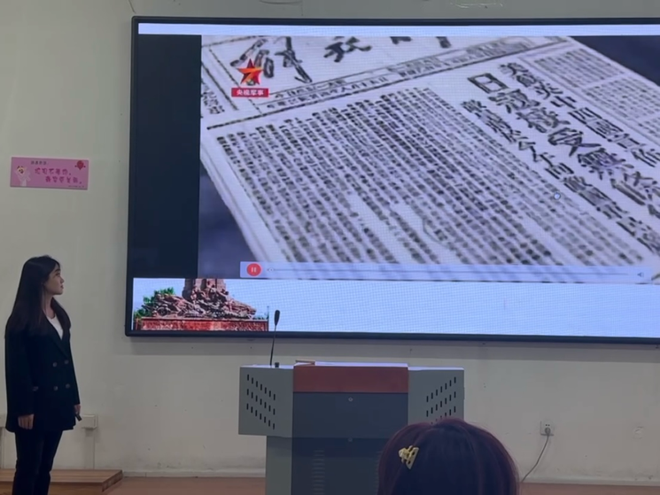 活动伊始,于欣玲以翔实史料阐释抗战精神,讲述在民族危亡之际,中华儿女怀着炽热的爱国情怀,义无反顾地奔赴抗日战场。面对敌人的残酷酷刑,抗日英雄们宁死不屈,以钢铁般的意志坚守民族气节;淞沪会战等惨烈战役中,军民同仇敌忾,用鲜血和生命诠释了血战到底的英雄气概。同时,她结合“九一八事变”东北沦陷、“七七事变”全民族抗战及南京大屠杀30多万同胞遇难等史实,警示各位同学勿忘国耻,珍惜和平,从抗战精神中汲取奋进力量。