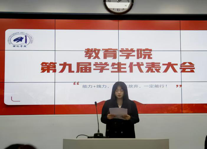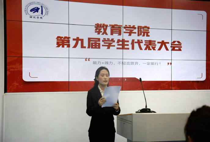 大会在庄严的国歌声中启幕。会议伊始,第八届员工会执行主席、2022级小学教育二班于安祺以“复盘过往、启智新程”为题作工作汇报。她从思想引领、破解服务堵点、打造特色品牌活动丰富校园文化等方面,诠释“从同学中来、到同学中去”的初心。结合履职经历,她分享了“以需求定方向、以担当强本领、以温度传价值”的心得,寄语员工干部怀揣“功成不必在我”的奉献精神、秉持“功成必定有我”的责任担当;并祝愿新一届团总支、员工会承优创新,以昂扬热情、务实举措与卓越成效,书写校园服务与员工发展的新篇章。