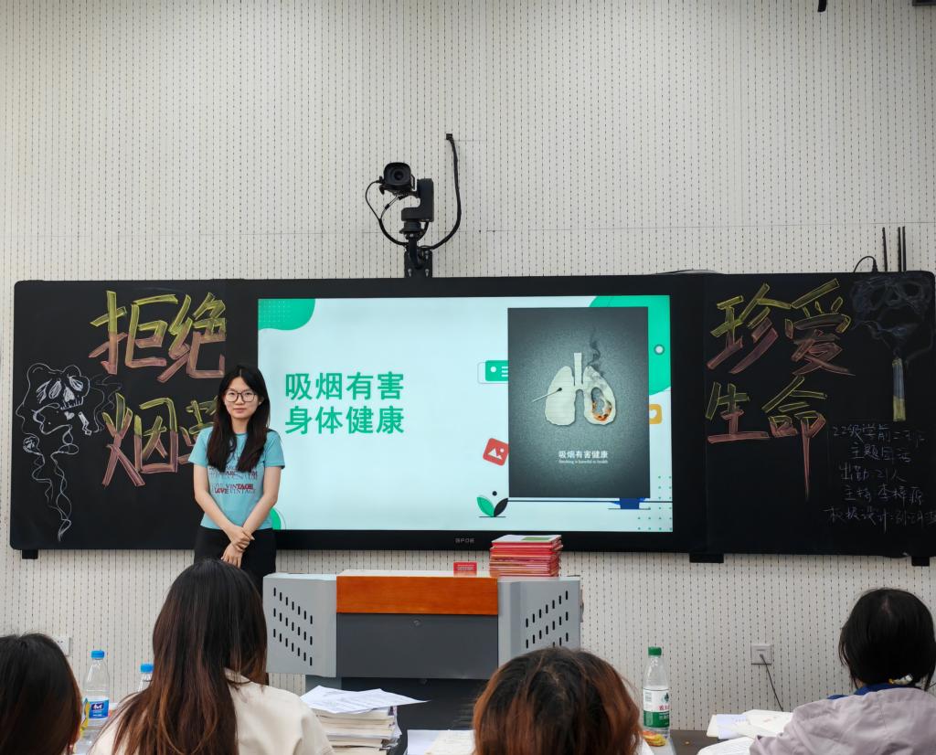 活动中,各班团支书通过发放控烟宣传海报、展示PPT、播放视频和分享案例等形式向同学们介绍了控烟的重要性,深入普及了吸烟对人体的危害、烟草的多种有害成分,让同学们直观清晰的感受到吸烟对健康的危害。同时,各班团支书鼓励同学们要在日常生活中自觉践行控烟理念,养成健康生活好习惯。
