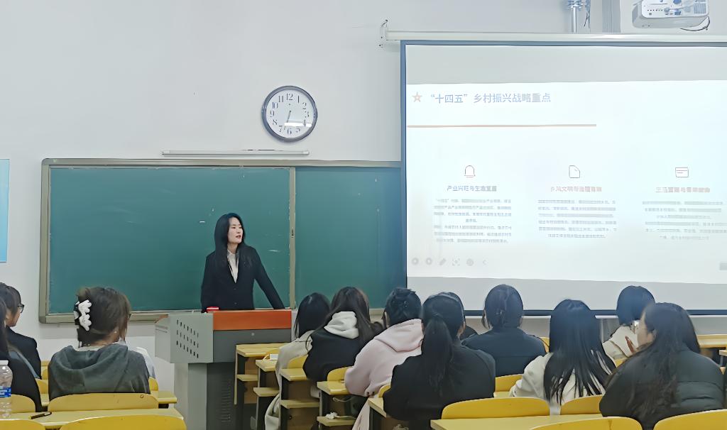 团课伊始,于安祺以“十四五”乡村振兴战略与青年使命为切入点,展开了深入而全面的讲解。她系统阐述了乡村振兴的战略重点,强调新时代青年应积极响应国家号召,充分发挥自身在科技应用、文化传承、基层治理等领域的创新优势,投身乡村振兴事业,为实现农村美、农业强、农民富裕贡献青春力量,成为乡村振兴的生力军。她的讲解,不仅让同学们对乡村振兴战略有了更为清晰的认识,也激发了大家投身其中的热情与决心。