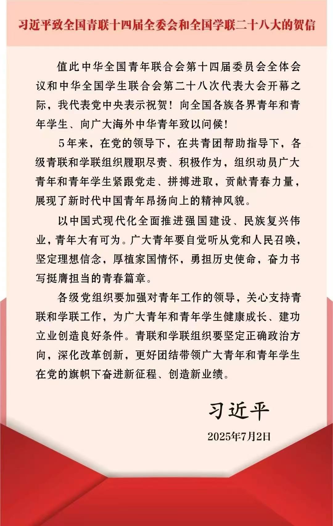 习近平总书记致全国青联十四届全委会和全国学联二十八次代表大会的贺信饱含深情、催人奋进。这封信不仅是对青联、学联组织过去五年工作的充分认可,更是对新时代中国青年寄予的深切期望和发出的时代号召。