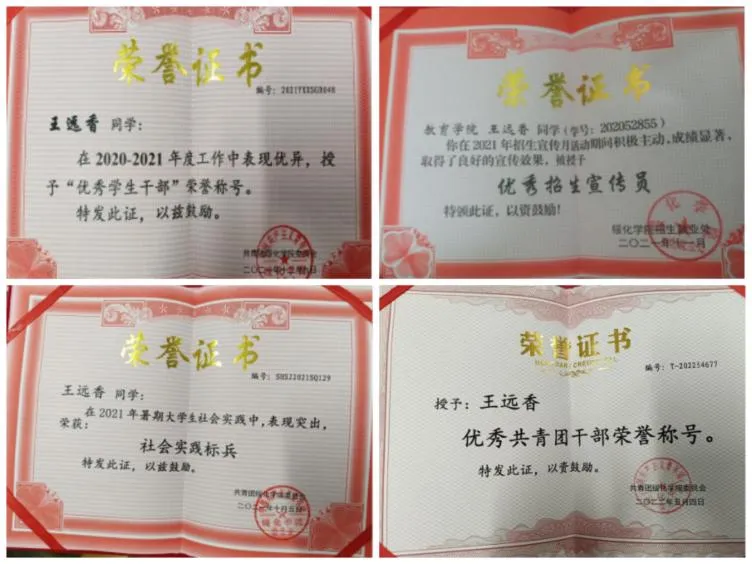 在大学的三年岁月,王远香同学始终秉持着“学而不思则罔,思而不学则殆”的理念。她刻苦学习,严谨务实,以分秒必争的精神及端正的学习态度,不断提升自身素质能力。她改进学习方法,养成了勤学好问的学习习惯。努力终成硕果,她的学习成绩一直名列前茅。