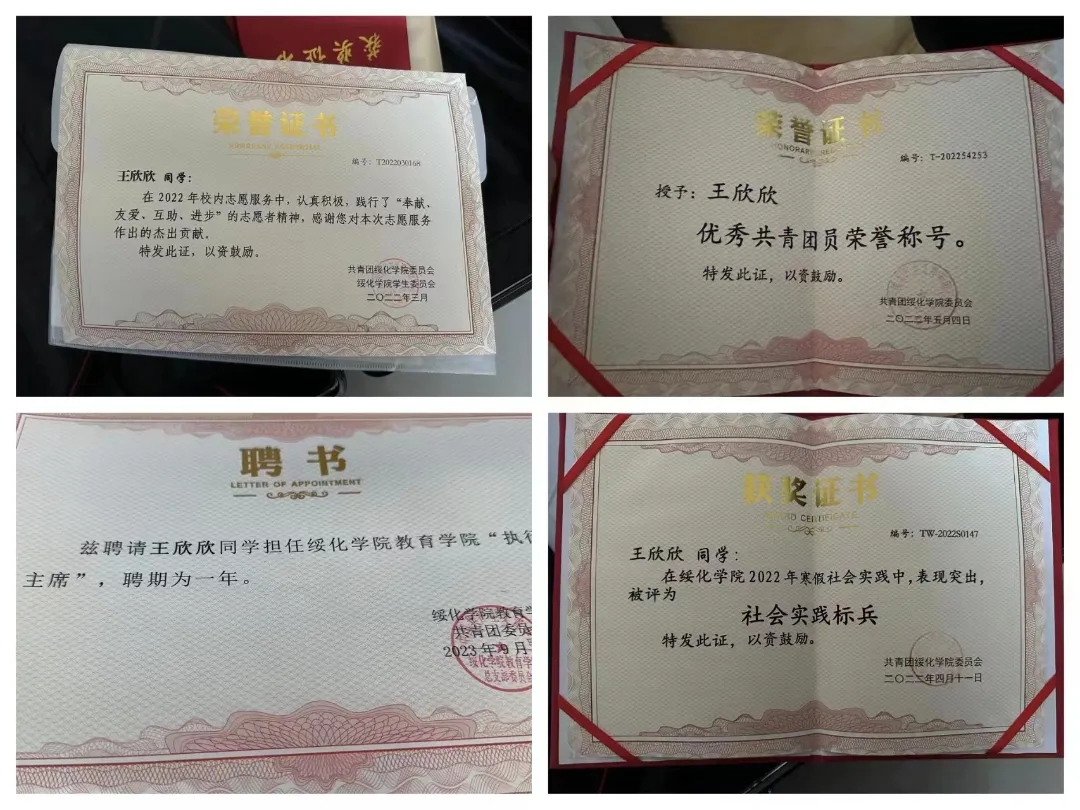 王欣欣同学在大学期间,积极参加志愿活动,曾在海伦市参加公益活动,为养老院老人包饺子、送温暖。在公司的志愿服务中,累计志愿时长142小时。