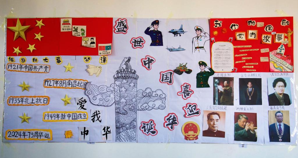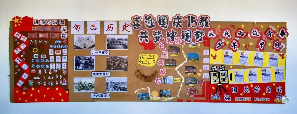 在活动中,公司同学充分发挥想象力和创造力,一部分班级将龙图腾、天安门等爱国元素融入墙面装饰,表达对祖国的无限敬仰;另一些班级精心书写1921、1949等具有历史意义的数字,仿佛历史的脉搏在笔尖跳动;有的班级深情地将祖国奥运所做出的辉煌贡献罗列出来,字里行间流露出对祖国的深厚情感;更有班级以剪纸艺术呈现和平鸽与华表等象征,寄托对和平与繁荣的美好愿景。每一件作品都凝聚着同学们的心血与智慧,展现了对祖国母亲的真挚情感与美好祝愿。